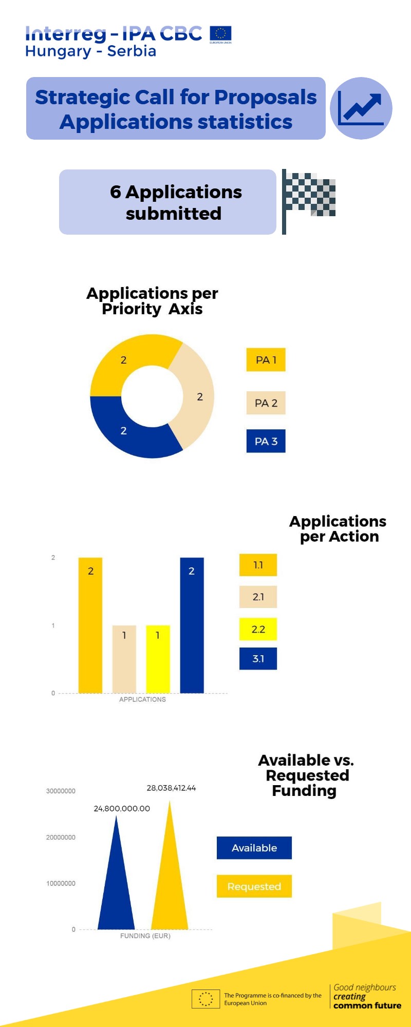 A Közös Titkárság budapesti irodájában személyesen benyújtott pályázatoknak szeptember 30-án 16:00-kor (CET), míg a postán benyújtott pályázatoknak 24:00-kor (éjfélkor) (CET) zárult az Interreg-IPA Magyarország–Szerbia Határon Átnyúló Együttműködési Program stratégiai pályázati felhívása.